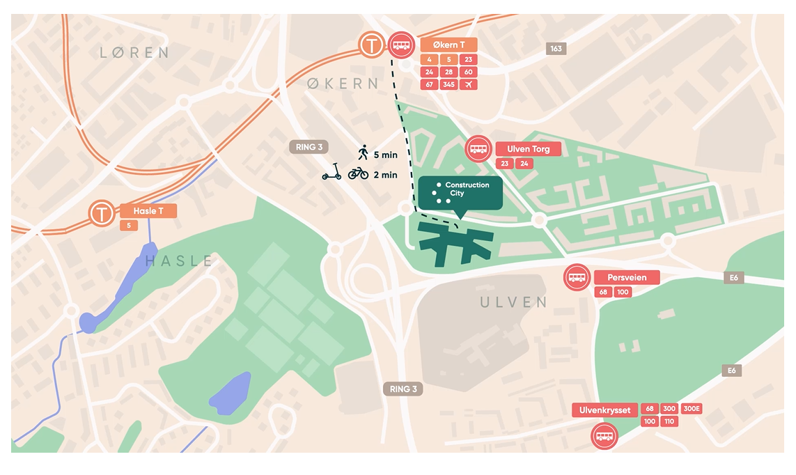 Oversikts kart på hvor Construction City ligger og beskrivelse på kollektive transportmidler til bygget